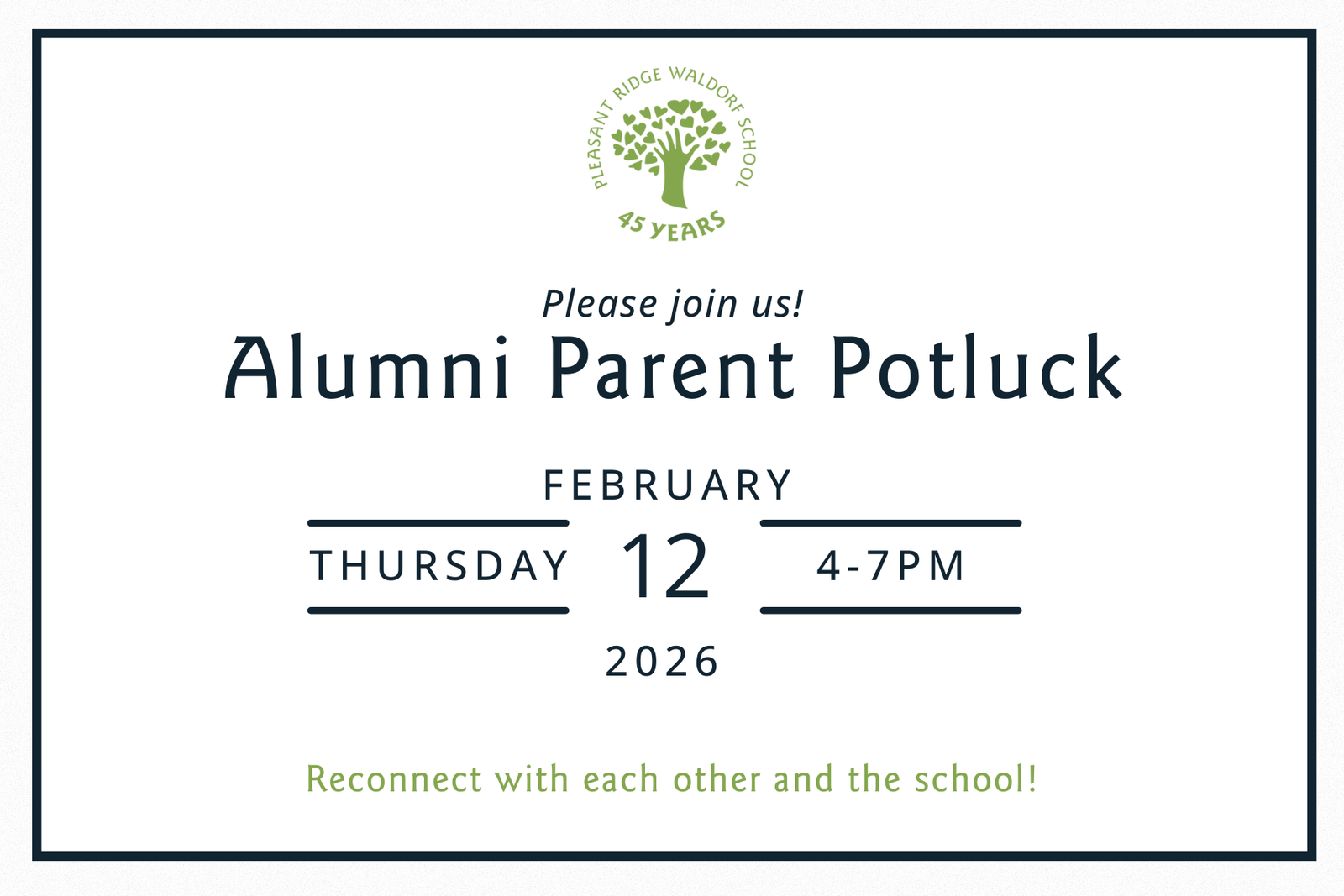 We warmly invite all parents of PRWS alumni students back to Pleasant Ridge for an evening of reconnection, conversation, and shared memories with fellow parents and the school. Classrooms will be open for touring throughout the evening and we will have memorabilia on display.