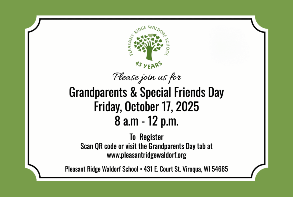 At PRWS, Grandparents and Special Friends’ Day is one of the most highly anticipated events of the school year by children, teachers, and our special guests alike! Each fall we invite guests into our school to experience a day in the life of their favorite PRWS student(s), and to learn about Waldorf ‘s unique approach to education. The day starts with a student assembly followed by classroom visits and a luncheon reception featuring an alumni panel who will share reflections fo their PRWS journey and answer questions.